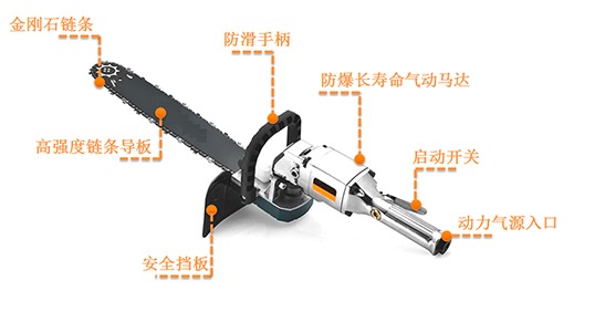 منشار هوائي PJQL-4 للاستخدام في المناجم (يشار إليه فيما يلي باسم المنشار الهوائي) هو أداة قطع وتخديد للمناجم، تم تطويرها من قبل شركتنا من خلال سنوات من الاستكشاف، بجهود مشتركة من المهنيين ذوي التقنية العالية من مختلف الإدارات مثل الهندسة الكهربائية والميكانيكية والتهوية وتعدين الفحم. يتكون المنشار الهوائي من ثلاثة أجزاء رئيسية: رأس المنشار، والسلسلة، والخراطيم المصنوعة من البولي يوريثين. تربط الخراطيم المصنوعة من البولي يوريثين مصدر الهواء والمنشار الهوائي. يدفع ضغط الهواء الذي يوفره مصدر الهواء المنشار الهوائي للعمل بسرعة عالية، مما يؤدي مهمة القطع. أثناء التشغيل، يتدفق ماء التبريد عبر الفتحة الموجودة في منتصف اللوحة الإرشادية إلى منطقة القطع، مما يؤدي وظائف التبريد وكبت الغبار. كما أن لديها وظيفة حماية مزدوجة لقطع المياه. عند القطع، يعتمد المنشار الهوائي القطع الرطب مع تبريد المياه لمنع ظهور الشرر أثناء عملية القطع. يمكن استخدامه لقطع طبقة الفحم والصخور في مناطق عمل التعدين، لبناء الجدران المحكمة الإغلاق، وأيضًا لكسر الخرسانة والصخور أثناء عمليات إنقاذ المناجم.